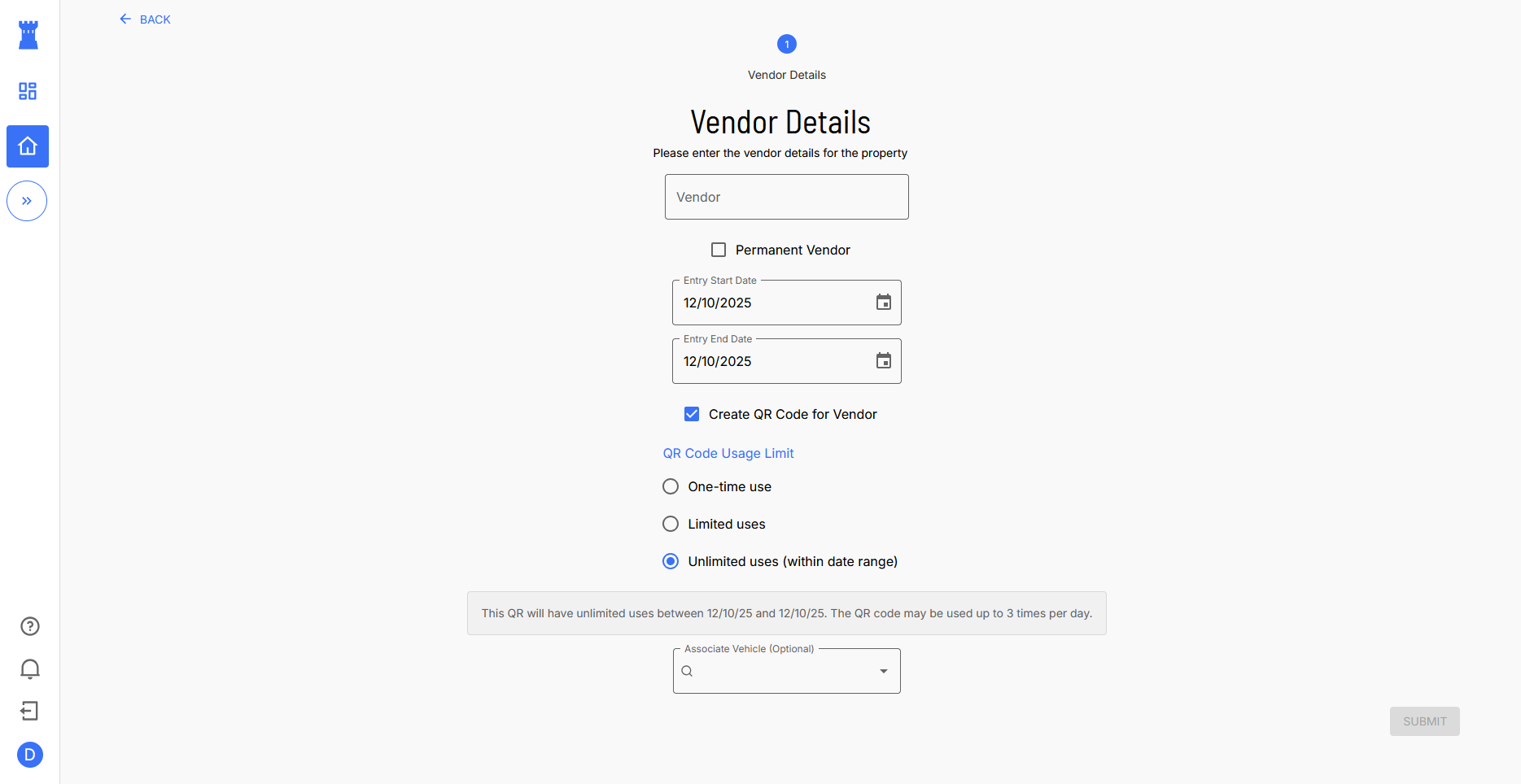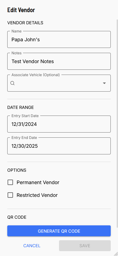 When adding a vendor, you can create a QR code they can use for easy entry at the gate. If you check "Create QR Code for Vendor," you'll see options for how many times the code can be used: