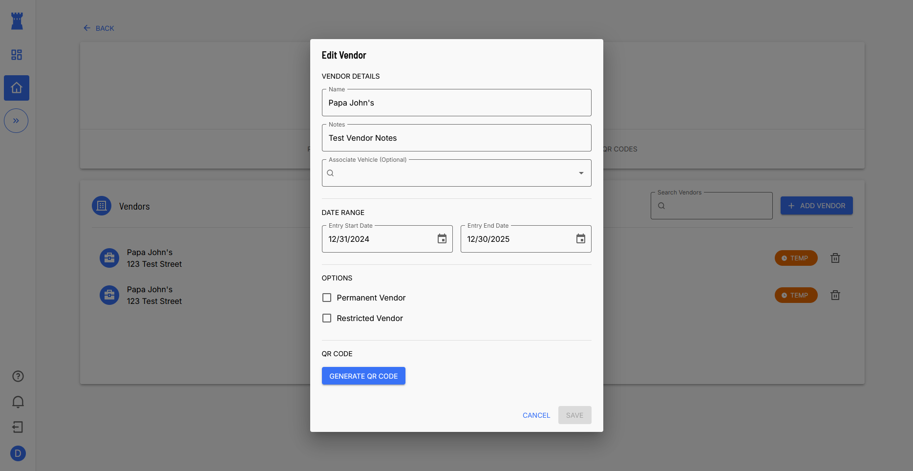 You can also generate a QR code for an existing vendor by clicking "Generate QR Code" in the edit window.
