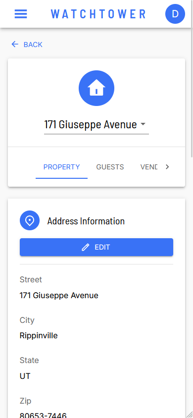 This section displays your property address including street, city, state, and zip code. Click or tap the "Edit" button to update your address if needed.