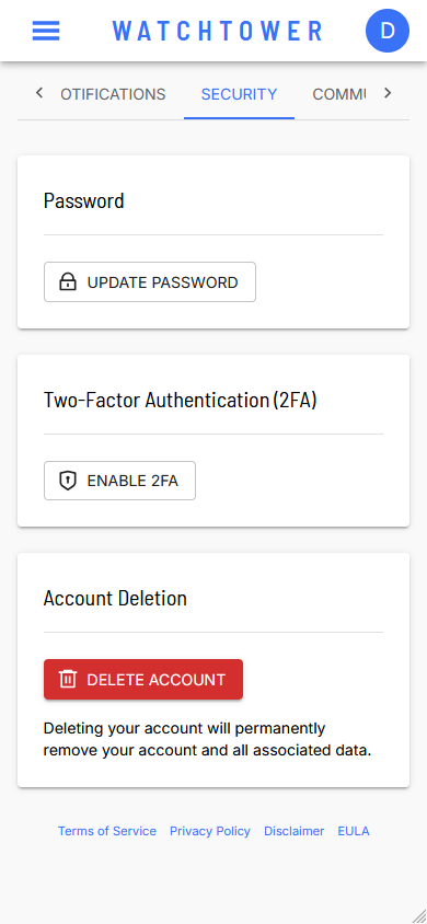 The Security tab is where you manage your password, enable two-factor authentication, and delete your account if needed. This guide explains each security option.
